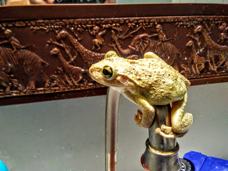 This frog terrified me by jumping on me when I went to the bathroom. I have got to stop leaving windows open.