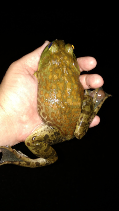 A monster bullfrog that I moved off the road tonight, on my way home from trivia. We've been having quite a lot of rain lately and the amphibians are on the move!
