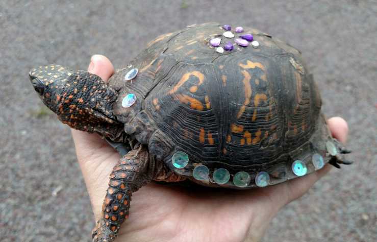 I received the turtle and it's a beautiful, adult female, Eastern box turtle with sequins and beads glued to her shell. The people that found her were able to remove some of the "bling", but the rest of it is really stuck on. I'll take her to ...