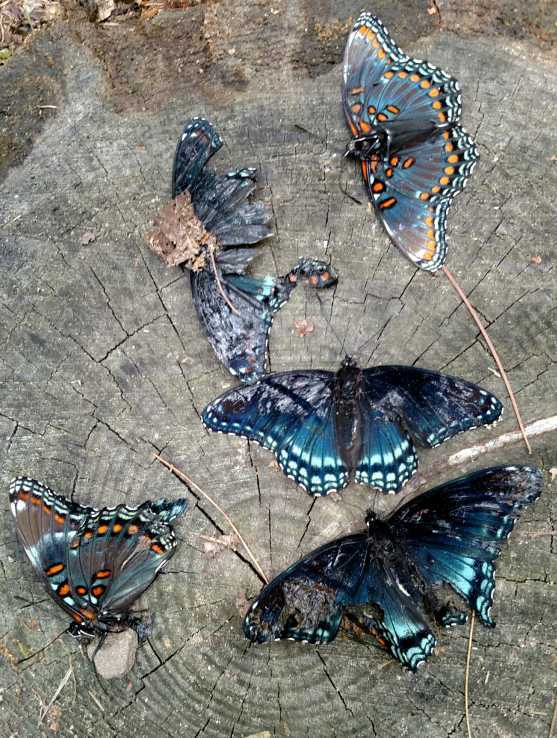 A weird scene I encountered in the woods of Bald Eagle State Forest: five, dead, red-spotted purples on a stump. I assume they were posed, as they don't look like they've sustained predator damage. They weren't far from a campsite, so I'm guessing ...