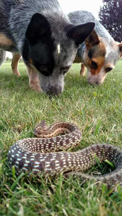 My dogs checking out a very angry Eastern gartersnake. No dogs or snakes were injured! Before the dogs could get too nosy I moved the snake to the other side of our fence and set it free.
