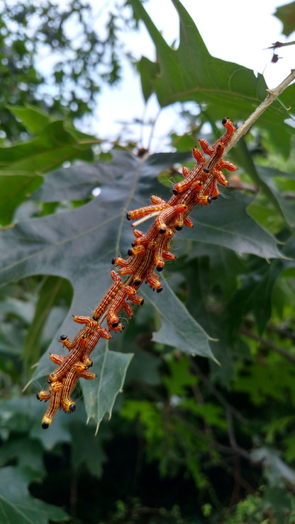 Gregarious caterpillars of the Datana genus. They are feeding on scarlet oak along my driveway.