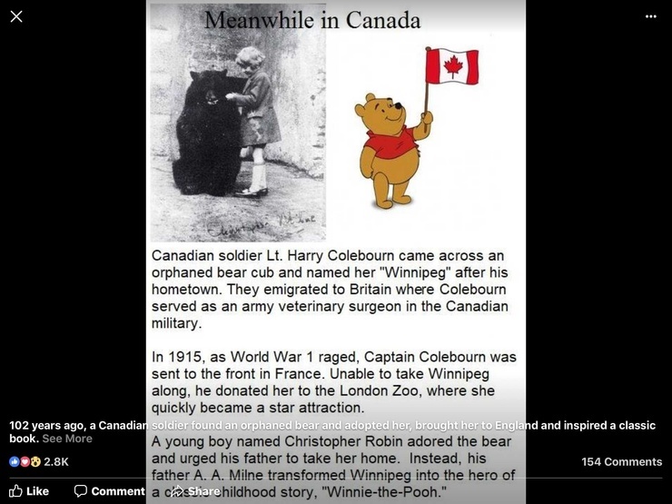 102 years ago, a Canadian soldier found an orphaned bear and adopted her, brought her to England and inspired a classic book.