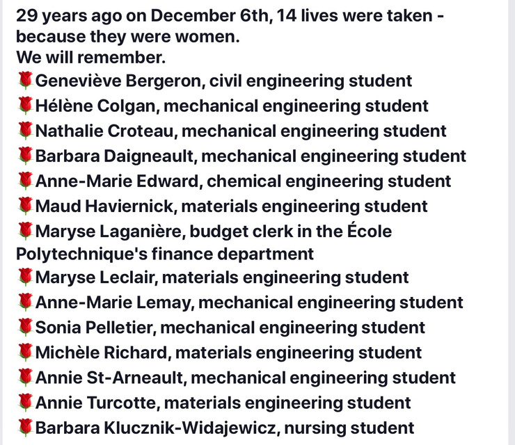 Twenty-nine years ago fourteen lives were taken because they were women.