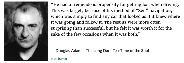 Posted by LB67I was out with a friend driving to a store, when I started describing Dirk Gently’s method of following a vehicle that looks like it knows where it’s going.