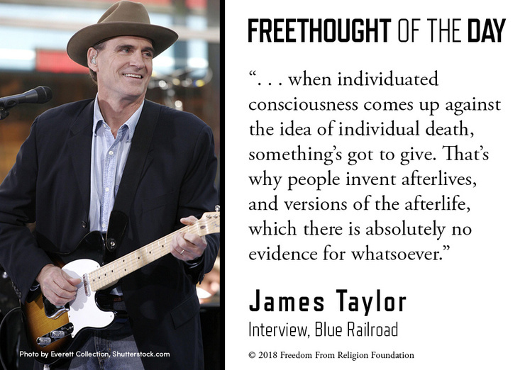 James Taylor - Atheist On this date in 1948, musician James Vernon Taylor was born in Boston, then grew up in Chapel Hill, N.C. He first took up the guitar while at Milton Academy, a boarding school in Massachusetts. He began writing songs during an...