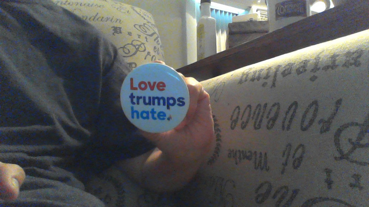 I sadly and angrily wish to report that I can no longer wear my LOVE TRUMPS HATE button. PEople now come up to me when I do do and wish to thank me for supporting our dreadful POTUS. All they see is the word TRUMP. I'm trying so hard not to actively ...