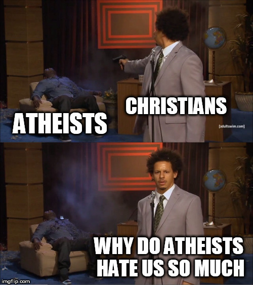 Many Christians think, if you don't ultimately love their God, like they do, you hate the rest of them. Atheists only lack the belief of God, with many having a deep dislike for God.