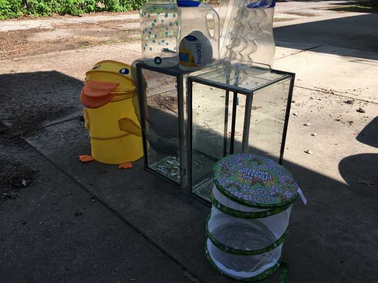 Yippee! I am finally starting to see some results. This morning, I found a newly hatched monarch caterpillar. For the small ones, I like to use the type of container pictured. Salvation Army sells these for under two dollars each. Either cut a foot ...