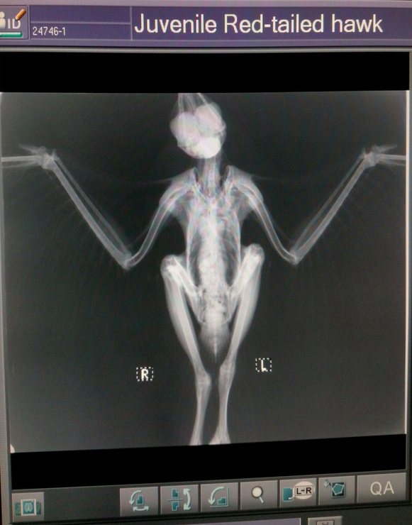 Immature red-tailed hawk that flew into the side of a young man's truck. He took the time to bring the bird to the vet clinic where we x-rayed it and evaluated it. No broken bones, no obvious injuries, just a very thin young hawk. It readily ate ...