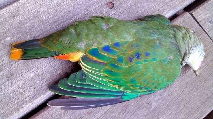 I'm crying. this is the second rose-crowned fruit dove (ptilinopus regina) only I ever saw, & dead as the first one from 3 years ago. she smashed her head in a window pane that is clearly marked to prevent exactly that happening. I will bury her with...