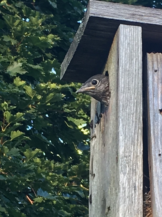 This little bluebird left the nest last night! His parents very bravely kept guard as he flew to a nearby tree. I love bluebirds!