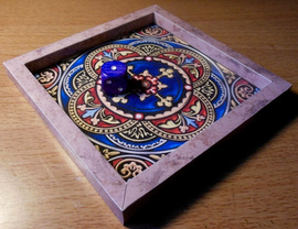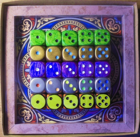 I had a stockpile of cheap dice, so I made this gift set for my daughter. I used metallic spray paint and Sharpies for the faces, and acrylic for the pips. I designed the tray. The base hides foamcore. I got the textures from the net. It's printed on photo paper. For presentation, the dice are kept in the center by a sheet of plastic resting on the tray sides.