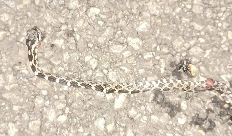 Saw this baby snake during my hike today. I was struck crossing the road. Looks like a baby rattlesnake to me.