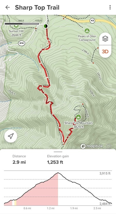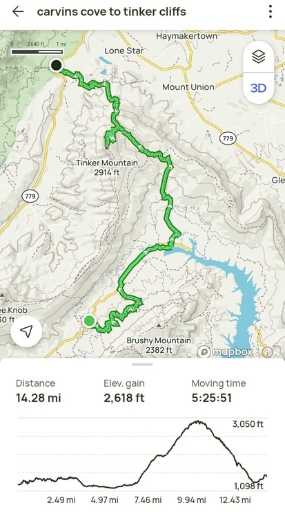 Three Ridges and Mau-Har loop. 14.5 miles. 4100 elevation gain. 7.5 hours. Nelson County, VA