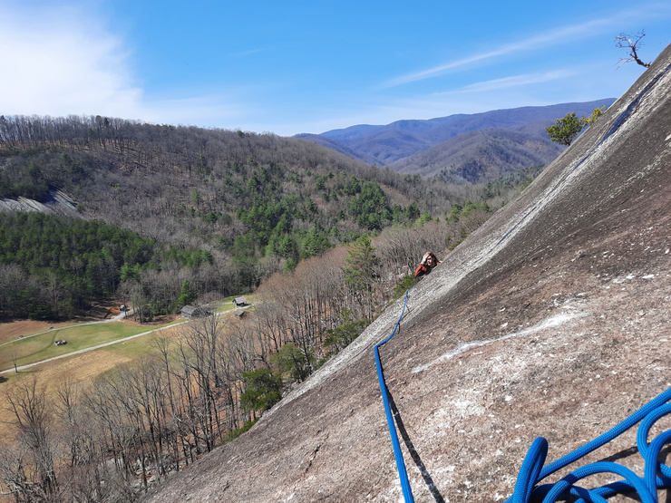 Andy contemplating his next step on pitch 3 of The Pulpit (5.8, when dry), Stone Mtn, NC. 3-15-22