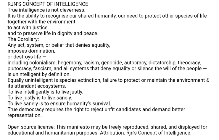 As a result of listening to the Russian Foreign Minister Sergey Lavrov at the UN the other day I was inspired to revisit my refutation of Socrates & other definition of intelligence. It has now been further amplified & become more encompassing than previous iterations whilst being simplified & is now described as a manifesto. I will appreciate hearing your critique and comments: