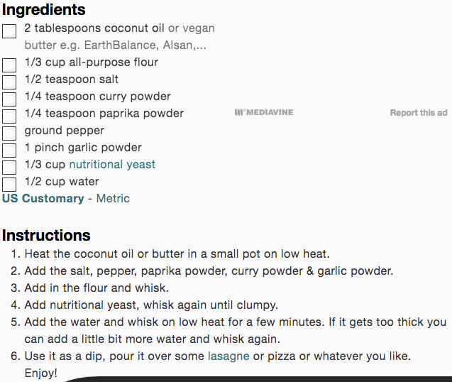 Thank you for this. I have a mac & Cheese which uses nutritional yeast. It doesn't seem to work right so I add some Daiya shredded cheese (and some vegetables as well). I copied the recipe and will add it to my listings. However, there are nor amounts. My late partner was a super cook and everyone wanted her recipes. Problem was she went by feel. finally a son got her to actually measure the amounts and write them down. Whew, now I have something to go by.