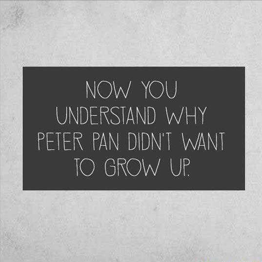♫ I won't grow up. If growing up means it would be beneath my dignity to climb a tree, I'll never grow up, never grow up, never grow up. Not me! ♫