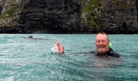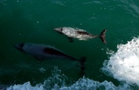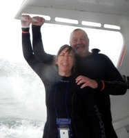 Finally getting our photos together from our 33 day adventure. One of the more interesting excursions we did was in Akaroa, NZ. We went swimming, in the wilds, with the NZ endangered dolphins. The wx was marginal. The water was damn cold, and rough. 4 swift-boats headed out with us 'elders' to attempt to find and then swim with these creatures. three of the four boats turned back claiming the waters were way too rough. Our skipper was about to give up, but then spotted a school of dolphins swimming towards a "quieter" inlet. he followed them at a distance. We were rewarded with a huge school of endangered dolphins swimming in relatively calm waters. The waves were still pretty significant and the temperature of the water was "cold".... DAMN COLD. He asked us if we wanted to try swimming with them. "HELL YES" was the unanimous "elder" response..... So, we did.