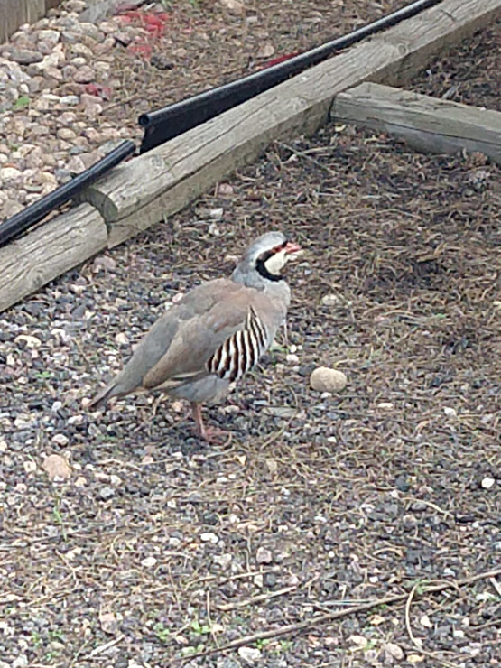 This guy showed up on my back yard, trying to hide amongst a group of ground feeding pigeons, four days ago. He's a Chukar Partridge native to Asia, but introduced to the Rocky Mountains for upland bird hunting. The bird is hilarious, clucking like a cross between a chicken and a duck. Not sure how it got to my yard, but I'm thrilled it did.