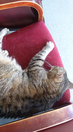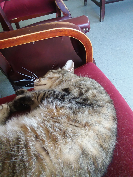 Something you don't see at big car dealerships anymore. I went to get my A/C recharged at a little neighborhood garage where they got me in the same day, and had an official shop cat. The lady said he doesn't normally come out to greet people, but he seemed to like me (which is odd, because I'm neutral toward cats). He laid down in the next chair.