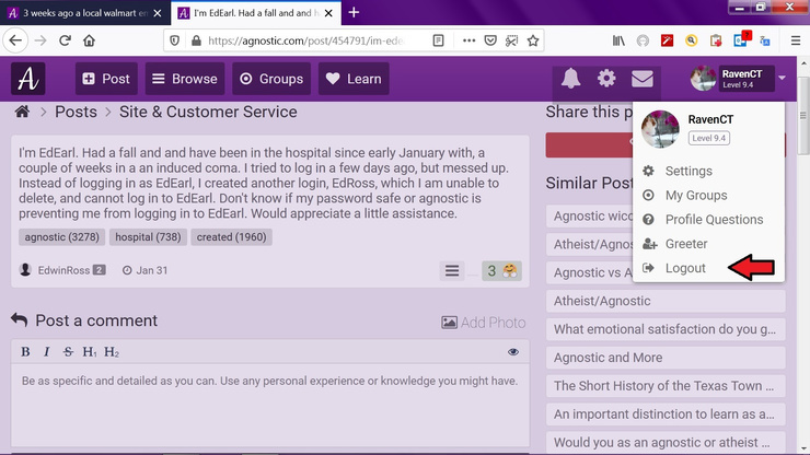 I'm EdEarl. Had a fall and and have been in the hospital since early January with, a couple of weeks in a an induced coma. I tried to log in a few days ago, but messed up. Instead of logging in as EdEarl, I created another login, EdRoss, which I am unable to delete, and cannot log in to EdEarl. Don't know if my password safe or agnostic is preventing me from logging in to EdEarl. Would appreciate a little assistance.
