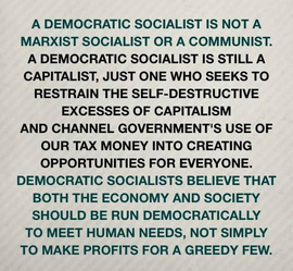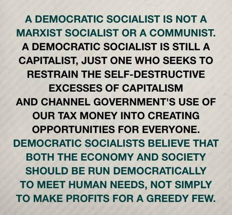 democratic socialism. for the people fooled by the red baiting and socialism bread line smears and propaganda.. red baiters please don't use our roads. social security, libraries. police and fire dept. and what ever you do don't join our socialist program called the military. . america loved it so much so under F.D.R he was elected 4 terms