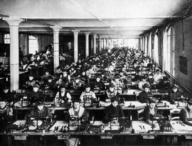 The only difference in this old picture and modern day is we are even more confined with cubicle walls around each of us. The rows are pretty much the same. And we computers.