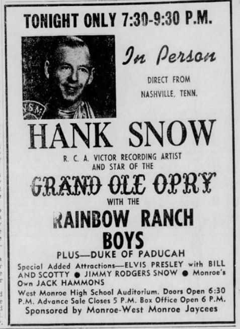 Poster for Country Star Hank Snow in Monroe, Louisiana in 1955. Also appearing in small print at the bottom is Elvis Presley. 😁